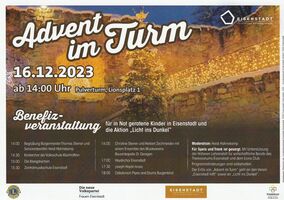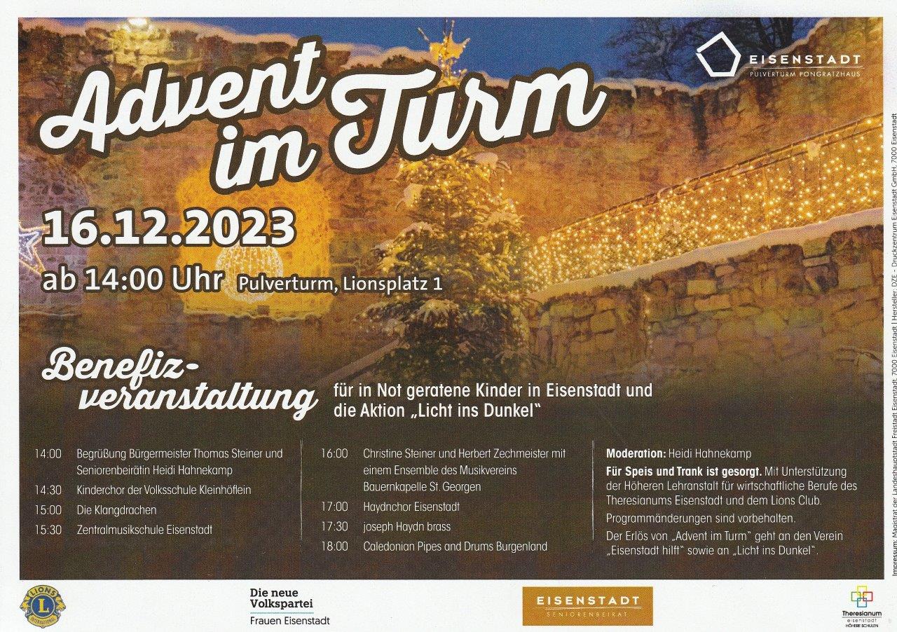 Am 16. Dezember 2023 fand wieder die traditionelle Benefizveranstaltung des Lions Clubs Eisenstadt, des Seniorenbeirates, des Theresianums und der ÖVP-Frauen für in Not geratene Kinder in Eisenstadt und die Aktion „Licht ins Dunkel“ im wundervollen Ambiente des Pulverturms statt. Nach der Begrüßung durch die Seniorenbeirätin Heidi Hahnekamp eröffnete Bgm. Mag. Thomas Steiner die Veranstaltung. Sodann sang der Kinderchor der Volksschule Kleinhöflein Weihnachtslieder. Im Anschluss stimmten die Klangdrachen des MV Bauernkapelle St. Georgen und einem Ensemble der Zentralmusikschule Eisenstadt die TeilnehmerInnen weihnachtlich. Es folgte Heiteres und Besinnliches mit Christine Steiner und Herbert Zechmeister und einem Ensemble des MV Bauernkapelle St. Georgen.