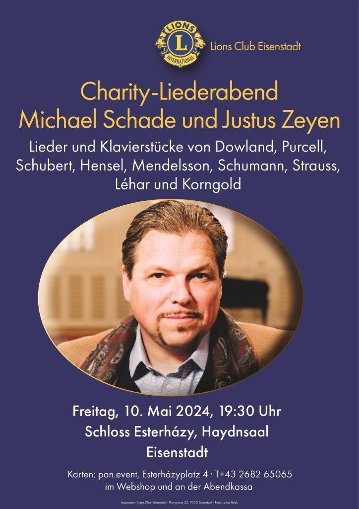 Gefeiert als einer der führenden Tenöre unserer Zeit, ist der Deutsch-Kanadier Michael Schade regelmäßig an den wichtigsten Opernbühnen und Konzerthäusern zu erleben. Auf Einladung des Lions Club Eisenstadt gastierte er am 10.5.2024 in Eisenstadt. Gemeinsam mit Justus Zeyen präsentiert er Lieder und Klavierstücke von Dowland, Purcell, Schubert, Hensel, Mendelsson, Schumann, Strauss, Lehár und Korngold.