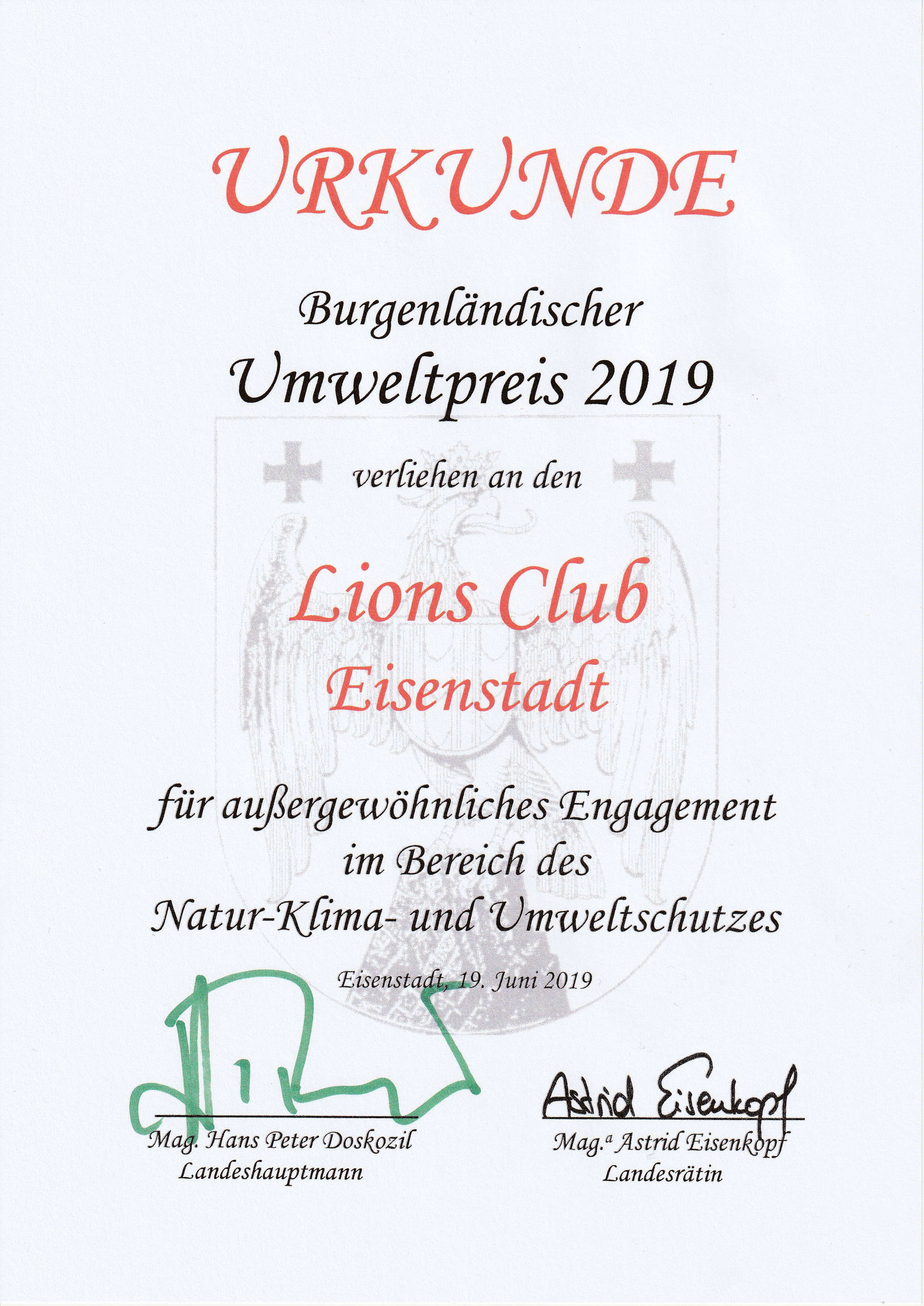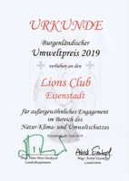 Für das Projekt Wasserlehrpfad Eisbach und das außergewöhnliche Engagement im Bereich des Natur-, Klima- und Umweltschutzes wurde der Lions Club Eisenstadt mit dem Burgenländischen Umweltpreis 2019 ausgezeichnet. Im Rahmen einer Festveranstaltung am 19.6.2019 im Nationalpark-Informationszentrum Illmitz würdigte die Umweltlandesrätin Mag. Astrid Eisenkopf die Leistungen der Preisträger und überreichte die Urkunden. „Umwelt und Klimaschutz kann nur gemeinsam funktionieren. Der Burgenländische Umweltpreis zeichnet Projekte und Menschen für besondere Leistungen in diesem Bereich aus. Danke an alle TeilnehmerInnen für dieses Engagement!“