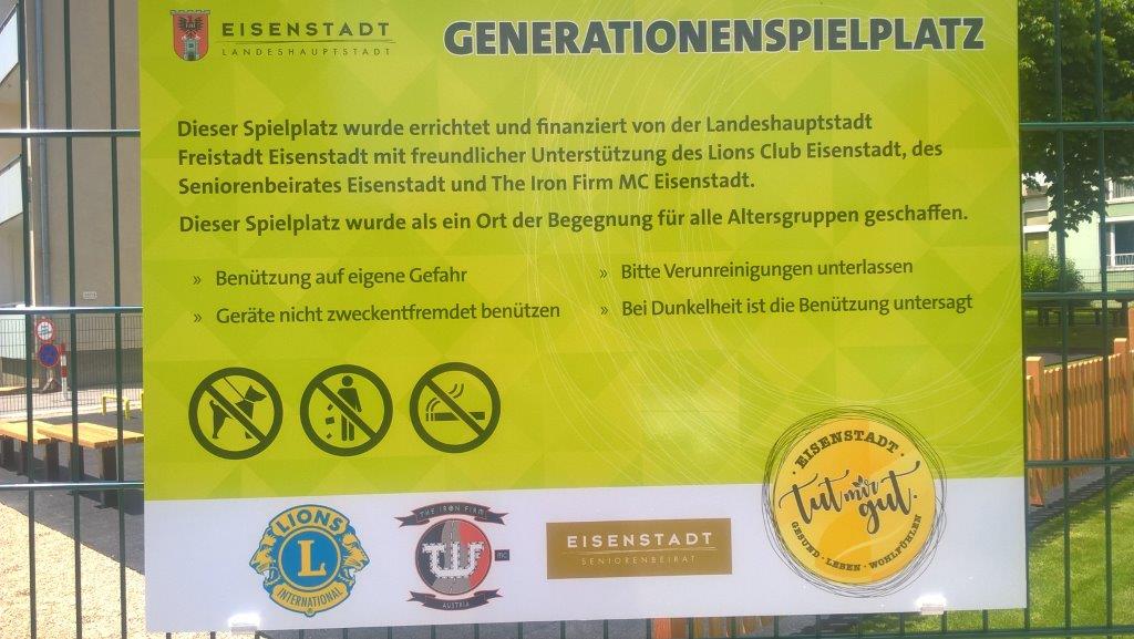 Anfang der 80er Jahre wurde von der Freistadt Eisenstadt mit Unterstützung des Lions Club Eisenstadt in der Wormser Straße der Lions Kinderspielplatz errichtet. Nun wurde dieser in einen generationenübergreifenden Spielplatz umgebaut. Der Lions Club Eisenstadt unterstützte den Umbau (Gesamtkosten 80.000 €) mit der Anschaffung eines Ellipsentrainers im Wert von 2.500 €. Auch der Seniorenbeirat und der Motorradclub „The Iron Firm“ spendeten insgesamt 1100 €. Die feierliche Eröffnung erfolgte am 26.5.2017.