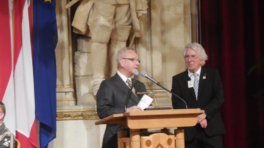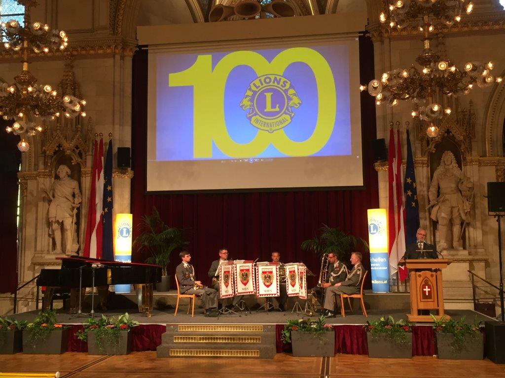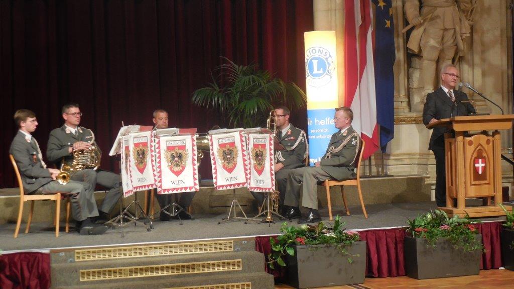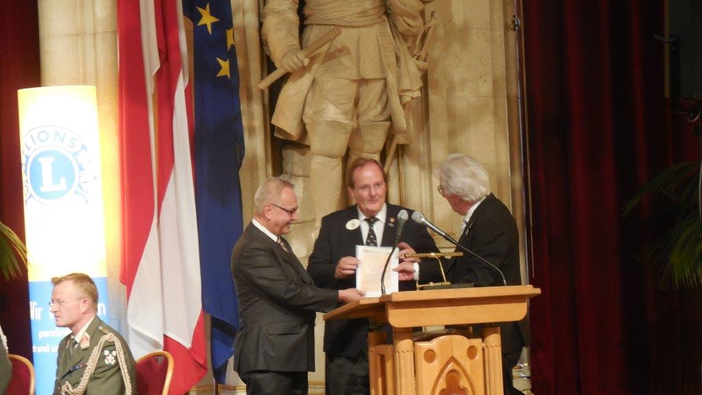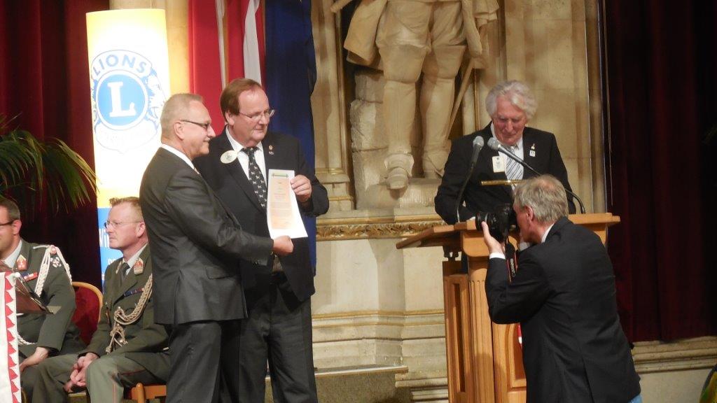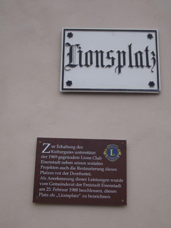 Auch wir konnten an dieser Feier aktiv mitwirken. Präsident Dipl.-Ing. Gerhard Spatzierer präsentierte kurz die Aktivitäten des Clubs. Er dankte dem Gemeinderat der Freistadt für den Beschluss in den 80er-Jahren, in Anerkennung der Leistungen unseres Clubs und für die finanzielle Unterstützung (100.000 S) für die Gestaltung des Platzes vor der Dombastei diesen als Lionsplatz zu bezeichnen. Das ist für unseren Club eine hohe dauerhaft nach außen sichtbare Auszeichnung. Gibt es doch im deutschen Sprachraum keinen sonstigen Platz, der nach den Lions benannt wurde.