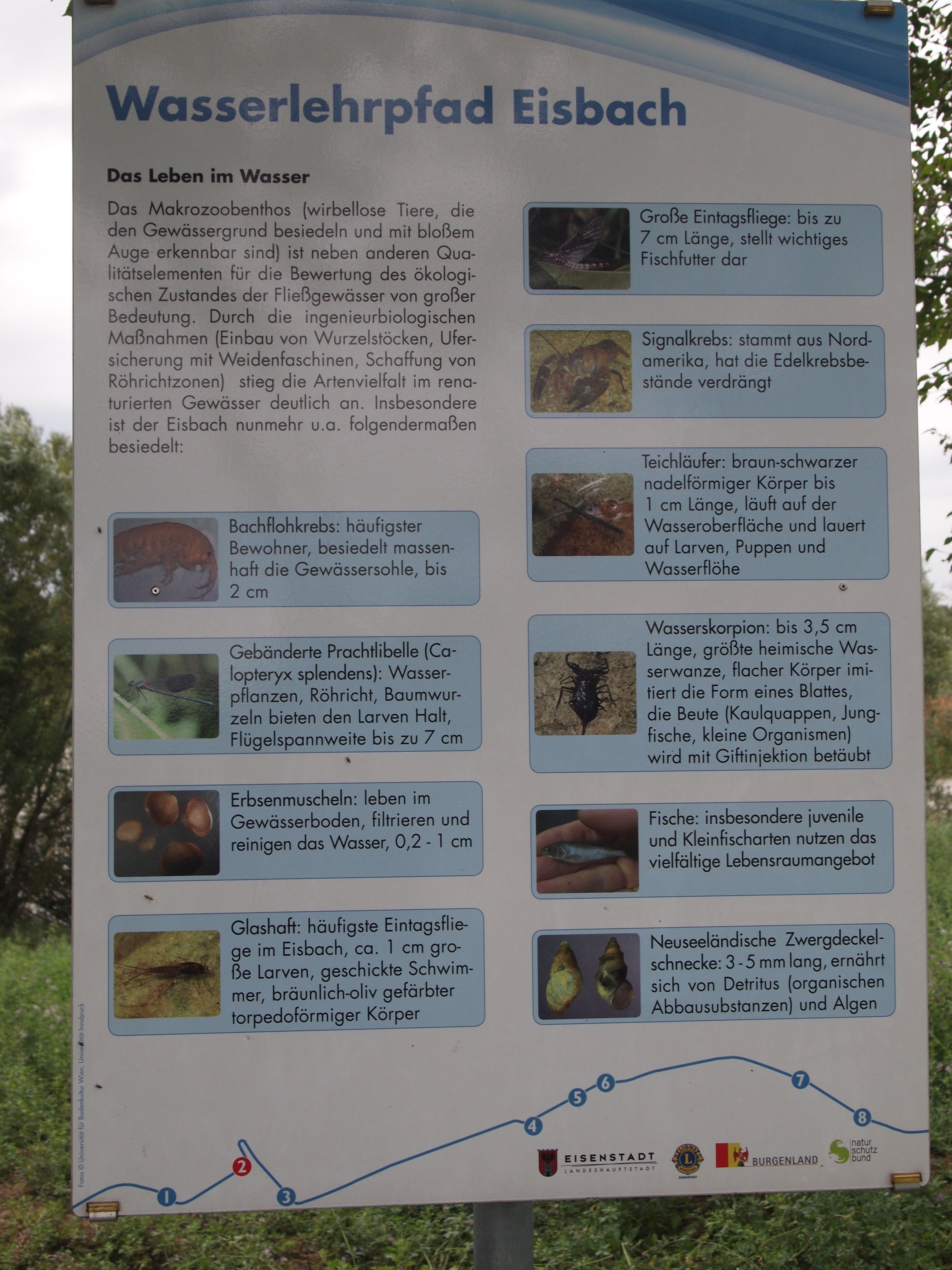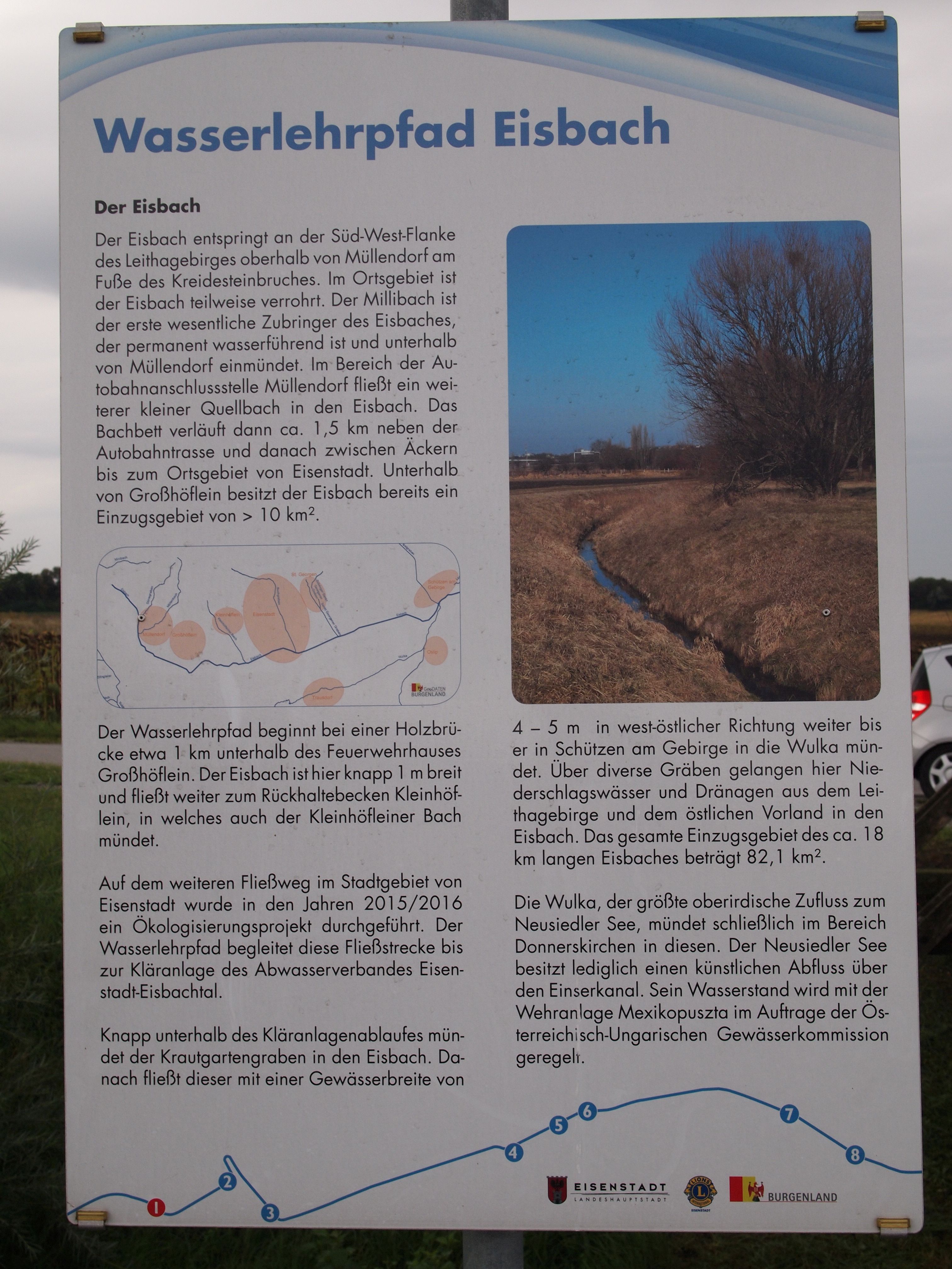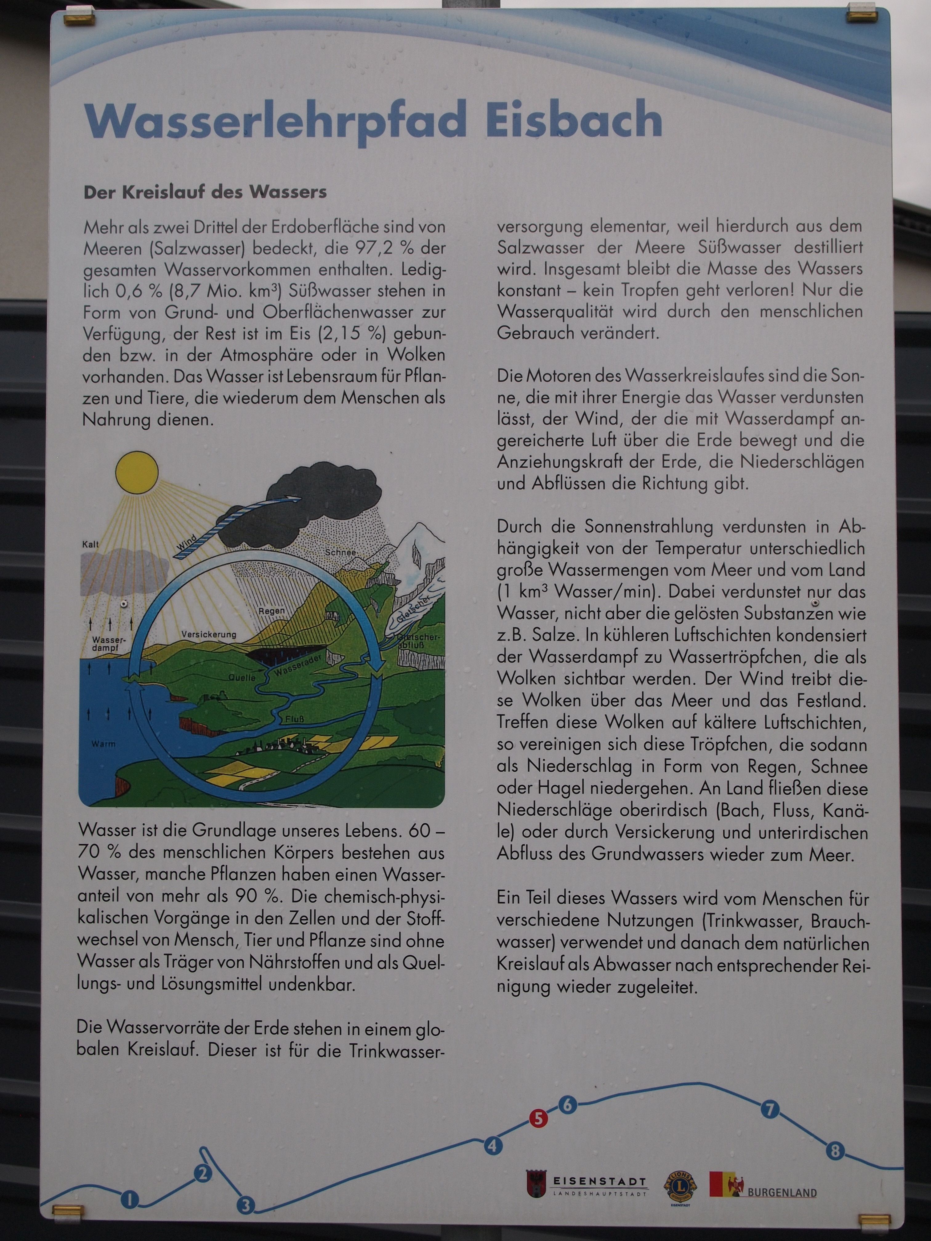 Anlässlich des hundertjährigen Bestehens der weltweiten Lions Vereinigung errichtete der Lions Club Eisenstadt in Zusammenarbeit mit der Freistadt Eisenstadt einen Wasserlehrpfad entlang des renaturierten Eisbaches in Eisenstadt. Auf 8 Schautafeln und mit einer Begleitbroschüre wird der Besucher über den Eisbach, das Leben im Wasser, den Hochwasserschutz, die Renaturierung von Gewässern, den Wasserkreislauf, die Wasserversorgung, die Kanalisation und die Abwasserreinigung informiert.